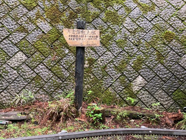登山口から少し進むと車庫らしきプレハブ小屋と「片倉線起点駅」の立て看板。ここからモノレールが始まっている。軽く腹ごしらえをして出発する。