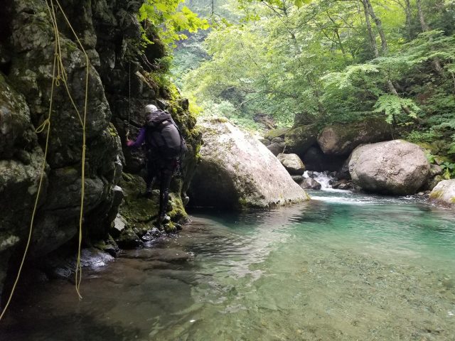 そこから先左岸を一度巻きました。残置ロープがありました。