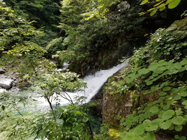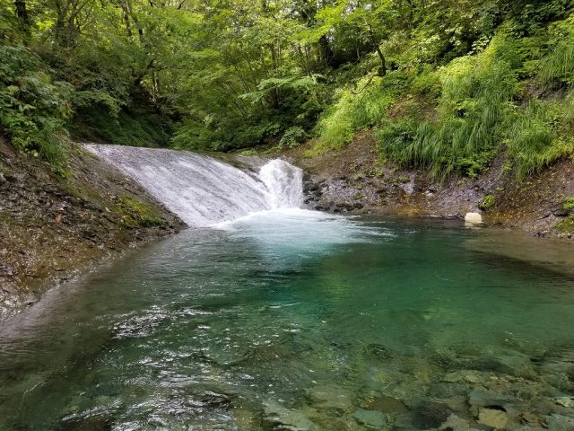 開放的な沢に陽があたり、水色がとてもきれいです。