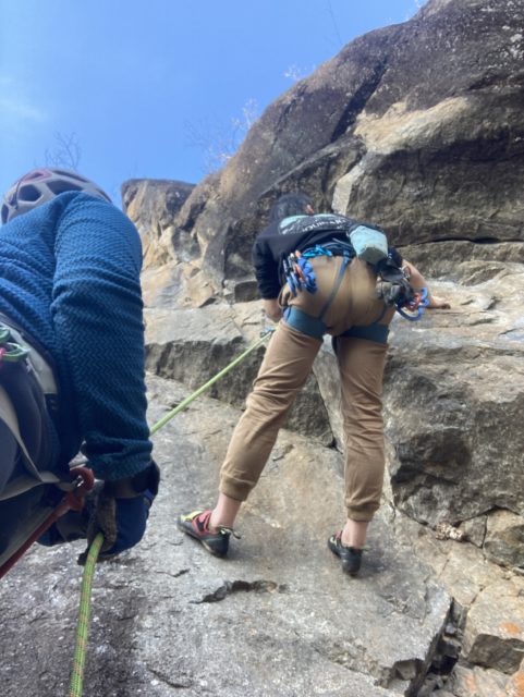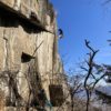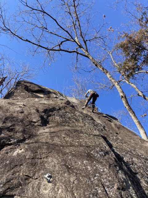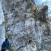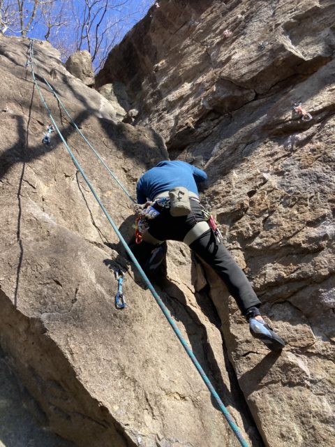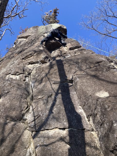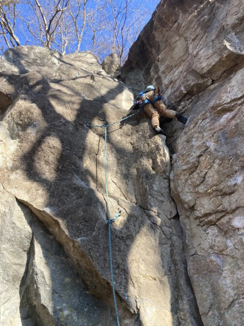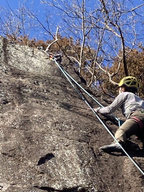 昼休憩の後は2階エリアで少し登った後3回エリアへ移動。ここには兜岩トポ本の表紙で使われているルートがある。出だしから高度感一杯だ。本郷さんはここを登りたいのか明らかにウキウキしているのが分かる。見るからに怖そうなので「見てるだけでいいや」と思っていたらトップロープを張ってくれたので米山さんも私も行くしかない状況になってしまった。本郷さんから親切丁寧なレクチャーを受け米山さんが2番手で登っていく。ガッツあふれるチャレンジだ。見事登りきるといよいよ私の番だ。1mくらい上にテラスがあり実質ここからスタートとなるが三角形の足場?みたいな石は「×」マークが付いてぐらついている。高度感があるがトップロープのおかげで怖さはなかった。ありがたや。