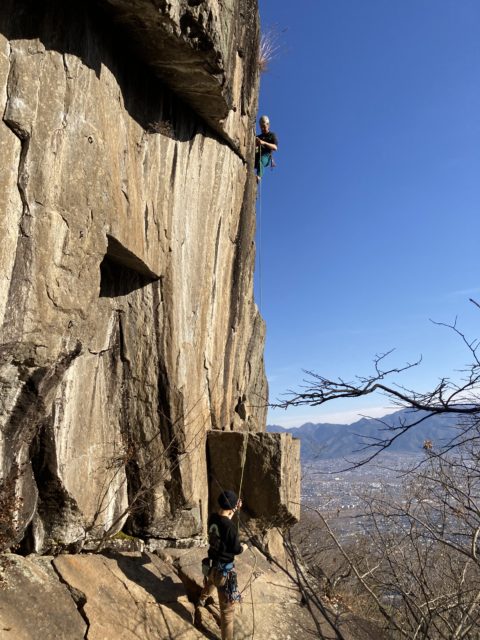 令和7年も押し迫った12月30日、朝7時に京王八王子駅に集合し兜山を目指して車を走らせる。移動中は入会ほやほやの米山さんと山やらなんやらの話しで盛り上がり、あっという間に一宮御坂ICへ。途中、春日居駅で伊藤さんをピックアップし兜山に8:45頃到着。トイレのある駐車場は満車で付近の邪魔にならないところに停めた。これでも来場者は少ない方だとか。。。陽当たりが良いので冬季でも暖かくて人気とのこと。ゲレンデの岩場はい広く、いつかのエリアに分かれている。今回は大手門エリアにした。他にも数パーティーが課題に取り組んでいて賑やかだった。このエリアでは「はじめの一歩」と言う課題から始めるのが一般的らしい。伊藤さんと本郷さん以外は初心者なので基本的にはトップロープを張ってもらう形となった。この課題を5人登ってから本郷・牛久と伊藤・星野・米山と2組に分かれて登った。みんなそれぞれ目標をもって臨んでいた。私はクリップが不慣れなので主にその練習をした。*これ以降の課題名やグレードは記憶があいまいなため割愛させていただく