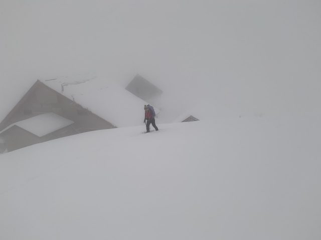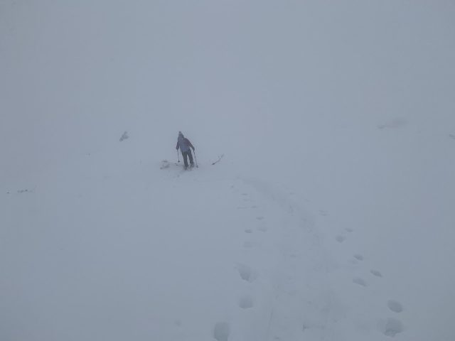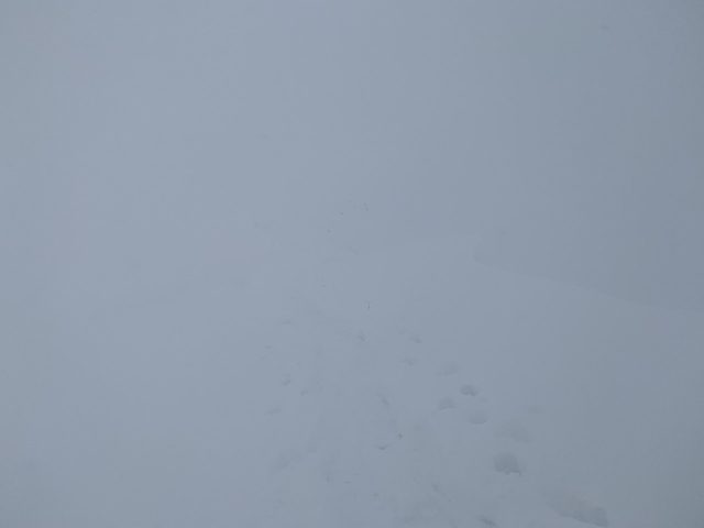 が、30分ほどラッセルした昨日の八方山ケルンの手前の尾根で1m程度の深雪&視界不良となる。あえなくリーダー判断で引き返すことにする。