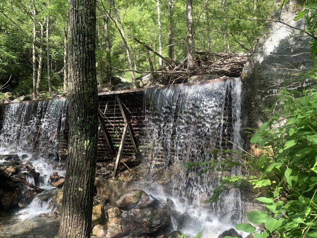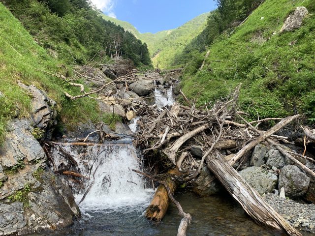 倒木の多い荒れたゴーロ状をしばらく行く。2-3mの岩組滝が数個出てくる程度でひたすら暑い中登っていく。ただし、水流中の岩の表面に良く滑る苔がついており神経を使う。