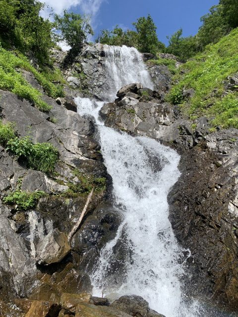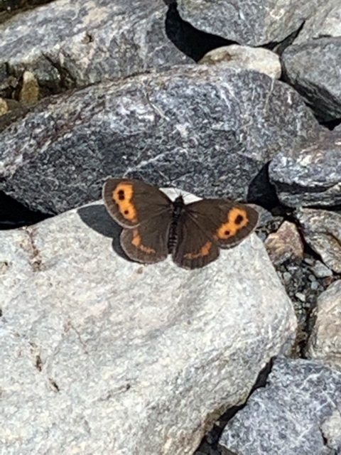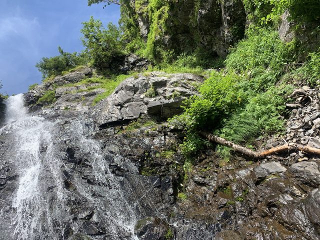 時間が充分あるので滝下で休憩を取る。高山蝶のベニヒガゲが汗を吸いたくて多数よってきてなごむ。