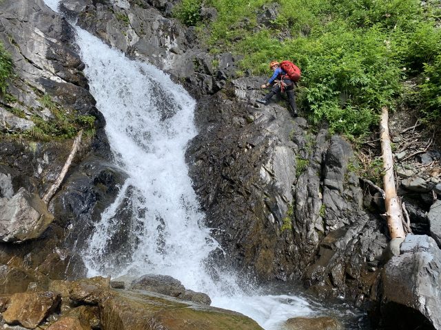 下段の滝は右のリッジ状をフリーで登る。ホールドスタンスともに豊富で問題は無い。