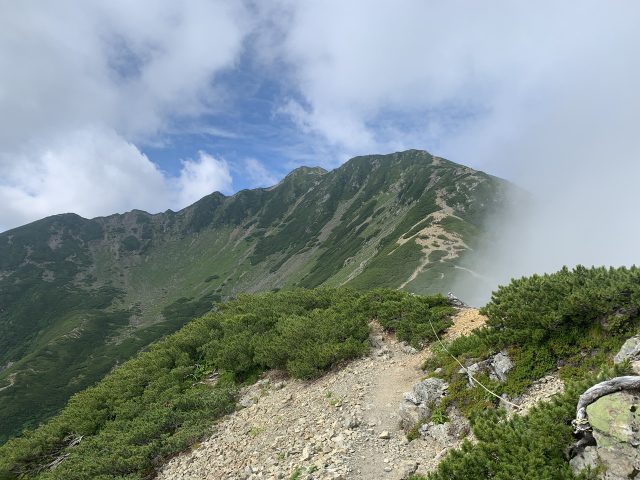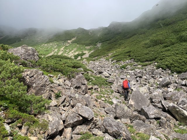 右の尾根を目指して適当な沢形を登っていく。登山道手前で這松の藪漕ぎとなるが、9時に登山道に出られた。