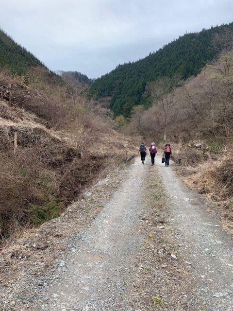 天気はイマイチなのに武蔵五日市駅9:00発の数馬行バスには登山者の長蛇の列、結局2台増発となり最後の3台目バスに乗り込む。南郷バス停まで30分と少しかかった。ROさん、Kさん、NTさんは先発のバスに乗りこんだようで、バス停で待っていた。バス停で草笛おじいさんと歓談したもよう。すぐに出発し、矢沢林道を歩く。まだ新緑には早く、桜や山つつじが所々に色を付ける枯葉色の世界。林道わきでタラの芽を数個収穫する。