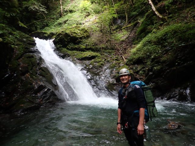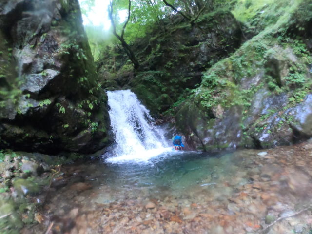 翌日は午後から雨が降るかもしれない予報だったためなるべく早く出発することにした。4時30分に起き6時に出発としたがなかなか寝付けなかったおかげでやや寝坊した。二日目の朝、陽が差してキラキラ明るい!この日は沢を3時間遡行しピークを踏んでから登山道を降るだけのシンプルに体力勝負の行程だ。難しい滝は無いはずだったのに出発してすぐに3つの登れない大滝がありいきなりの高巻きをした。おかげですっかり目が覚めた。あんちょこは最後まで確認しておかないとダメだと反省した。