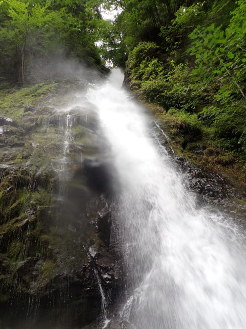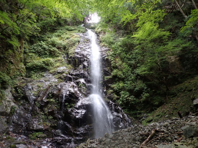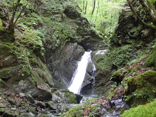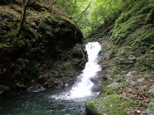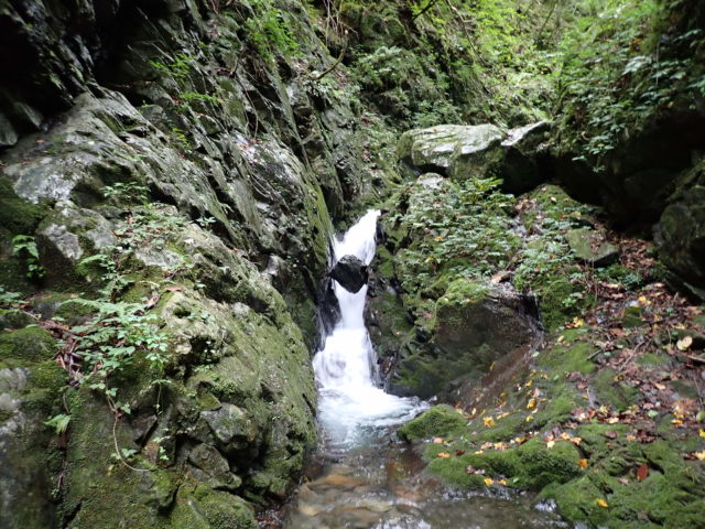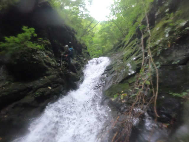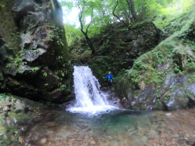 ヘアピンカーブの駐車場には同じく沢登りと思われる車が3台停まっていた。本流の大洞川から仕事道を15分くらい歩いて和名倉沢へ入渓した。渓は若干増水しているが濁りはなくとてもキレイだった。渓相は苔むしてうす暗く、いかにも「奥秩父の沢」といったところ。初日の行程は7時間、900m上げるのでペースよく歩かないと時間切れになってしまう。その点、同行者とは歩くペースが合うので安心していた。