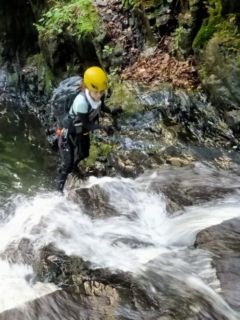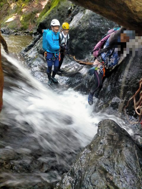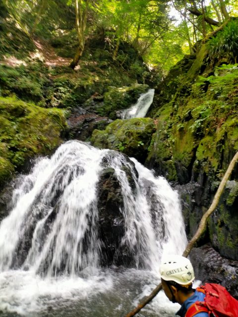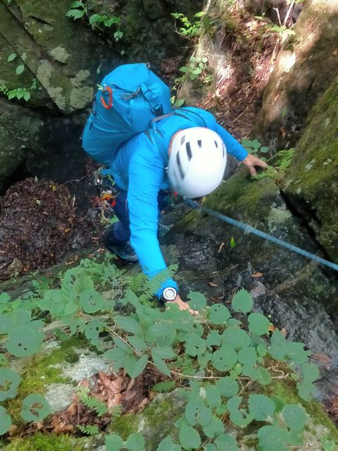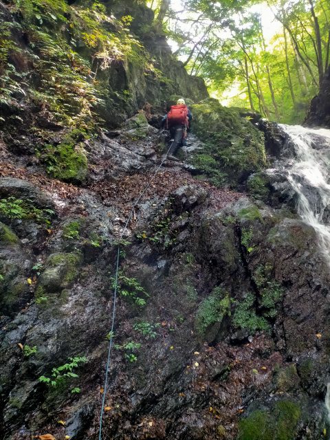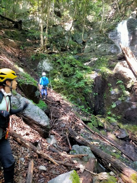 この後、5m、7m、8mの滝を左側から一気に高巻きます。急登のザレ場で、何度か滑り落ちそうになりながら登り、懸垂下降とトラバースをして今回最大の12m滝の前まで来ました。