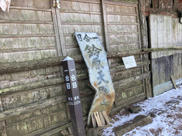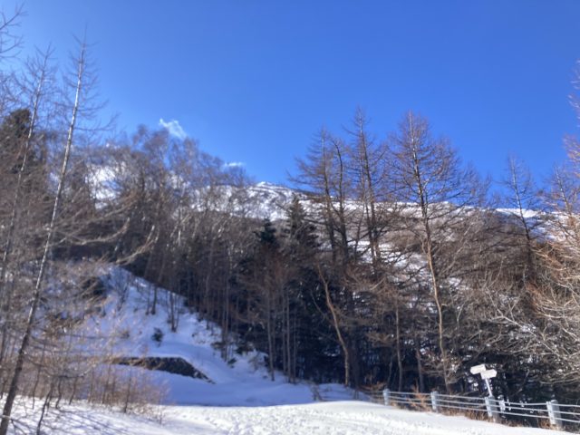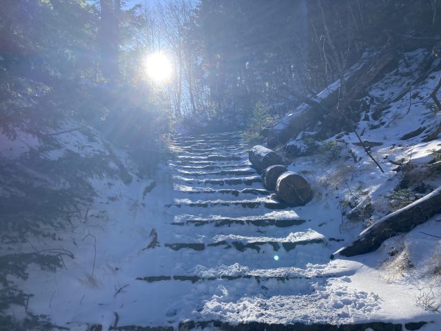 鳥居をくぐり、樹林帯を進みます。今シーズン冬山をしっかりと歩くのはこれが初めてなので、計画通りに帰ってこれるか少し不安を抱えながら登り始めました。樹々の間から射し込んでくる太陽の光を受けて気持ちよく登っていきます。樹林帯に囲まれているので風の影響は受けず快適な登りです。