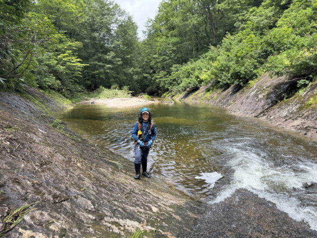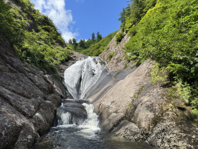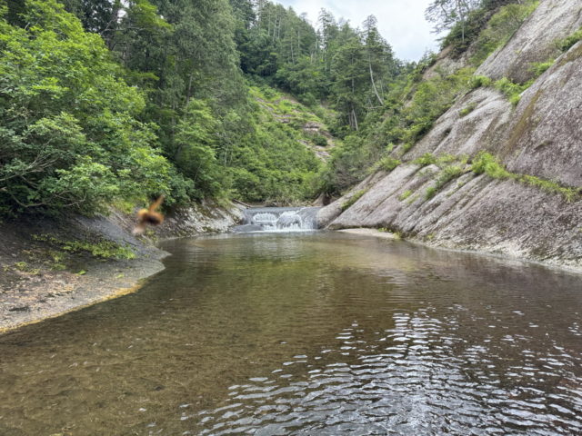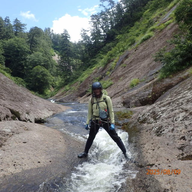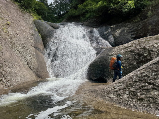 左俣の下降は基本舗装路のようなナメが続いていてとても易しい。二俣が近づいてくると滝がかかるようになるが何れも下降可能な斜滝だった。