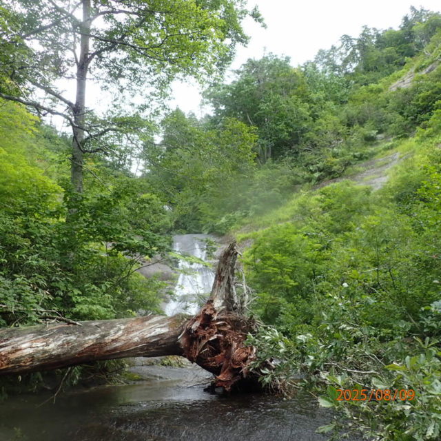 8/9:森吉山野生鳥獣センター(9:00)-赤水沢・桃洞沢分岐(9:45/50)-桃洞滝(10:15/20)-赤水沢・桃洞沢分岐(10:39/45)-赤水沢二俣co699m(11:55/12:15)-兎滝(12:45/13:00)-co915m鞍部乗越(15:15/27)-石黒沢左俣泊場co750m(17:15)