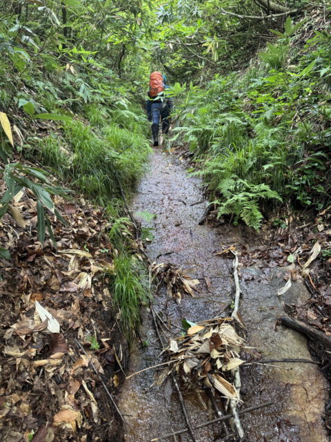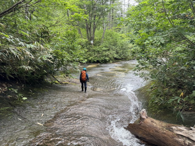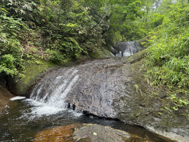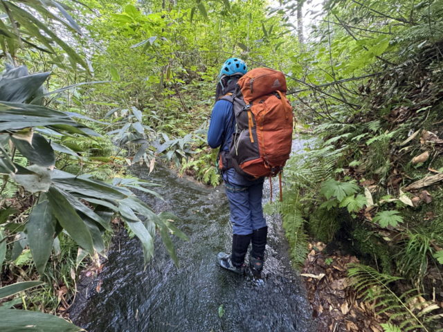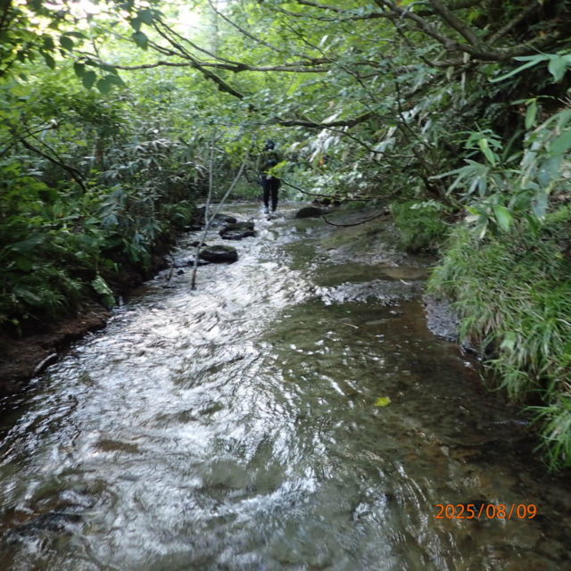 徐々に流れは細くなっていくが足元はナメがどこまでも続き、ほとんど藪漕ぎ無しで玉川水系の石黒沢左俣へ乗っ越すことができた。