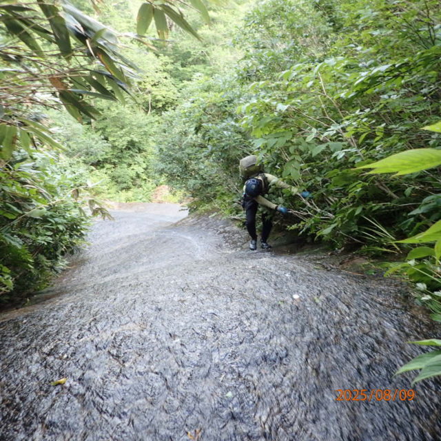 九階滝の枝沢は倒木のかかる6x9m滝で始まり、その上に25x30mのスラブ滝が続くがしっかりしたトラロープが左の潅木帯に張られておりそれを使用させてもらう。