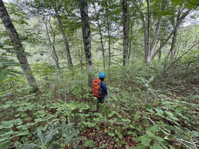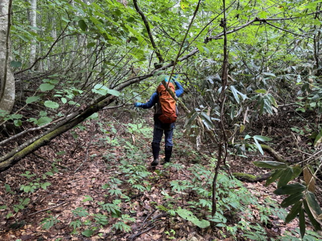 林道に上がり右俣方面に所々濃くなったヤブ林道を1時間程度進む。