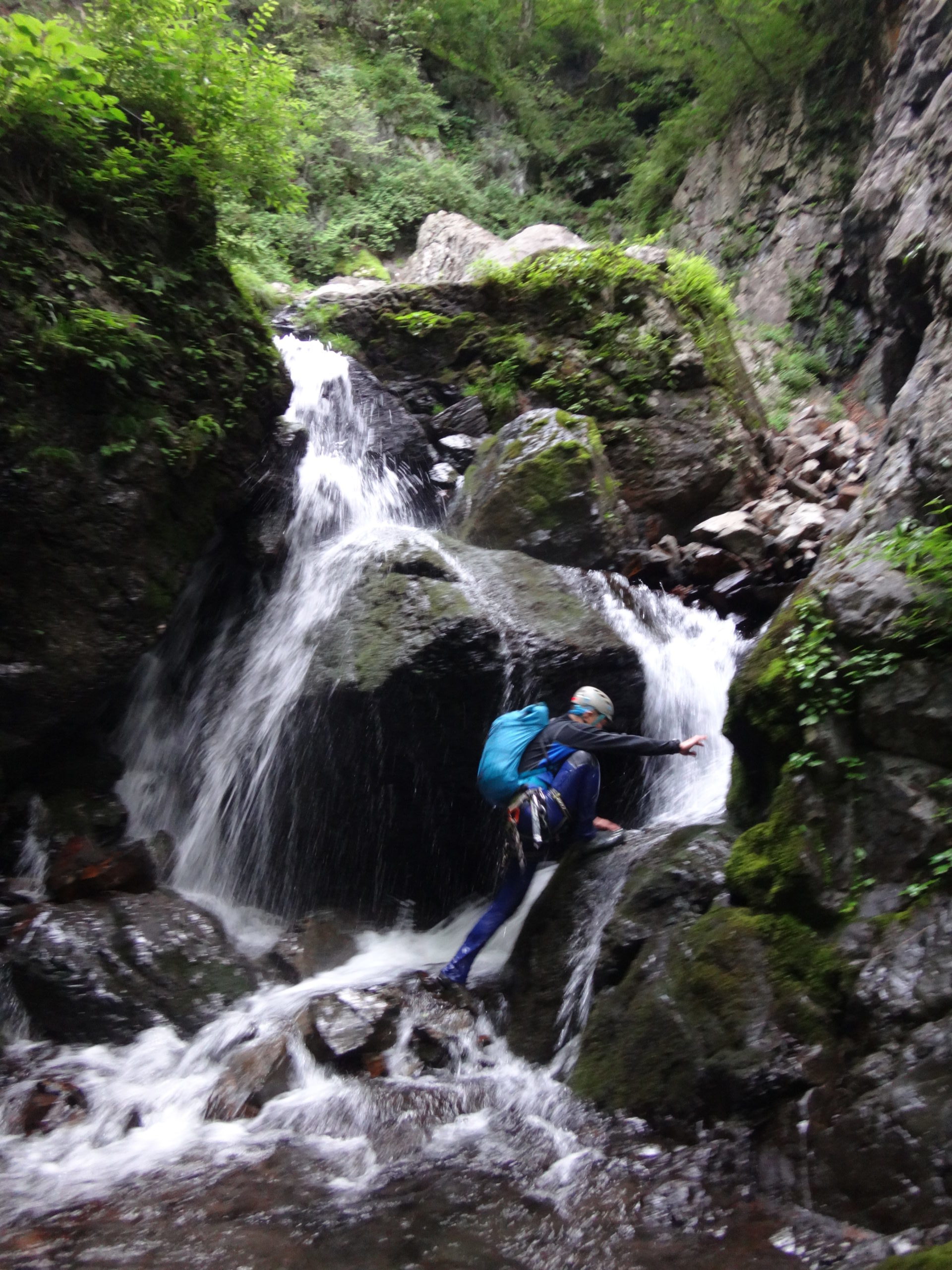 この小滝は左側から泳いで取り付いて登りました。右からだと泳がなくてすみます笑 いくつかの滝を私も先陣をきって登らせてもらいました。