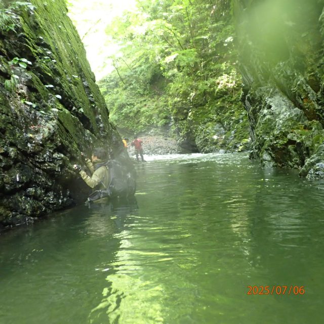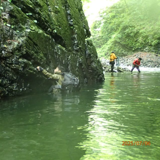 ②場所移動して深場でのへつり、ザックピストン、ラッコ泳ぎの実施。私はネオプレンを2枚づつ着込んで参加したので大丈夫でしたが他の方は深場のへつりで体温を奪われみるみる間に唇が真っ青になってしまいました。 実際は防寒していないので、皆がへつりで進むなら水の抵抗をなくすべくできるだけくっついて進むか、リーダー一人がへつり/泳ぎで進みあとからロープでリュックでザックピストンで進むのがいいと感じました。