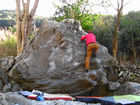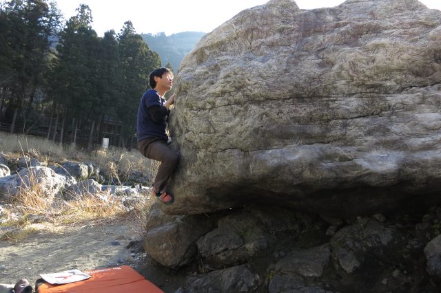 御岳橋下から約20分くらい歩いたところに次のお目当てである「チキンドーム」があります。割と新しめの課題のようで、他の岩から離れたところにポツンとありました。大岩が水に削られ球状に窪んでいます。下段はツルツル、上段はガバ。ハングしているので足の置き場が無くて腕が疲れました。