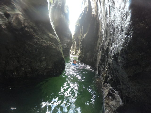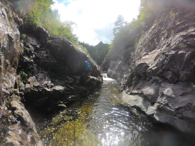 9月27日(土)今回の山行ではこの日の行程が一番長く、集中力も必要なためなるべく早く動き出そうということになり、4時起床5時出発。雲一つなくすっきり晴れている、良かった。登るルートは水流があるいわゆる右ルンゼ。水流の左右両側にルートが取れるようだが、よりスピーディーに登れる右を登る事にした。フラットソールに変え登攀開始。出だしの10mほどロープを出したがその後はフリーでグイグイ登れた。遠目で見たより傾斜はきつくなくザラザラしていてよくグリップする。あまり急ぎすぎるのも勿体ないので景色を見に焼き付ける。途中でなるべく写真も撮るようにしたが割とあっけなく落ち口下のテラスまで来た。ここから灌木を進むことになるので再びフェルトシューズに戻した。少しボサを登り頃合いを見て左方にある水流の方へ進むと丁度落ち口の上に復帰できた。ここからは稜線が見えたので詰めの辛さはそれほど感じなかった。ヤシロ尾根には9:15に到着。紅く色着いた木(ナナカマドかな?)など薄い藪に覆われた稜線を下降点まで30分歩いて割岩沢へ向けてドゾウ平沢を降った。この下降が意外と曲者で特に後半に懸垂下降をしなければならない滝が続いたため思いのほか時間が掛かった。なお、懸垂の支点はしっかりした残置があったのでよく確認してからありがたく利用させていただいた。割岩沢に降りると左(上流)にジッピと呼ばれるゴルジュがあった。切れ立った岩壁の奥に細く、そして深い流れが確認できる。何とも神秘的だった。先を急ぎたかったがこのゴルジュを泳がないわけにはいかないだろ?となり寒いのを我慢しつつ15mほど泳ぎ奥に入ってみた。水は透き通っていてとても綺麗だったが深くて底の様子は分からなかった。震えながら岸に戻ると14:00だった。翌日の行程を考えてテンバは予定通りユウ沢出合いにしたかったので休むことなくペースを上げて割岩沢を降った。へつると時間が掛かるため泳げるところは積極的に泳いだ。疲れていたが頑張ったおかげで陽のある16:30にユウ沢出合に到着した。ここは右岸に丁度いいテンバがあったが薪が少なくて思うような焚火が出来なかった。