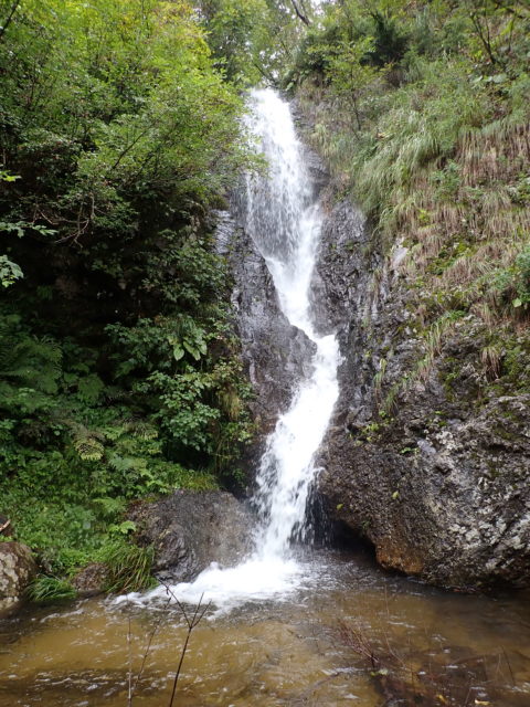 9月26日(金)4時に起床し6自出発、室谷川に沿って車を走らせるがこの室谷川がひどく濁り増水もしている。昨夜の雨のせいだとしてもものすごい荒れ方だ。しばらくして支流の倉谷沢に進み目的の一の俣橋に到着。橋から沢を覗くとなんとほとんど平水で濁ってもいない!良かった。装備を整えて7:30いよいよ三日間の沢旅のスタート。アプローチとして利用される一の俣沢は水量こそ少ないものの勾配があり大滝も二つ、おまけに滑りもある登りごたえのある普通の沢で「舐めたらあかん奴」だった。
