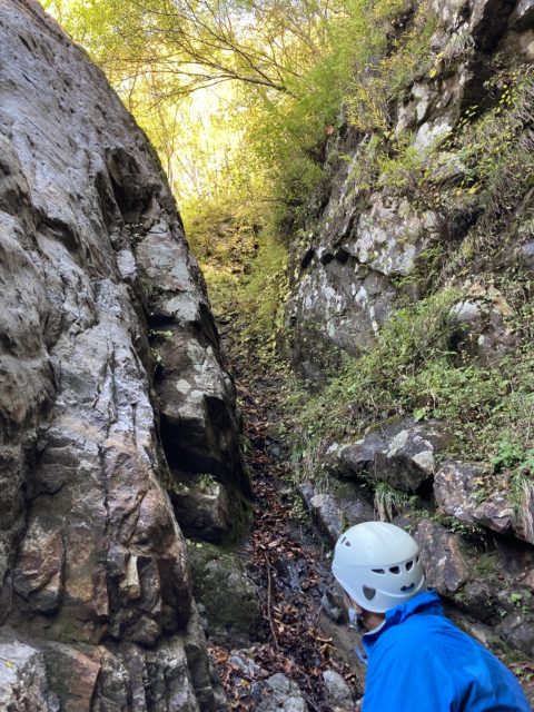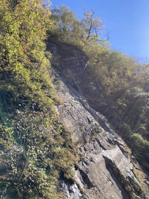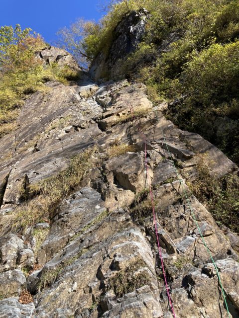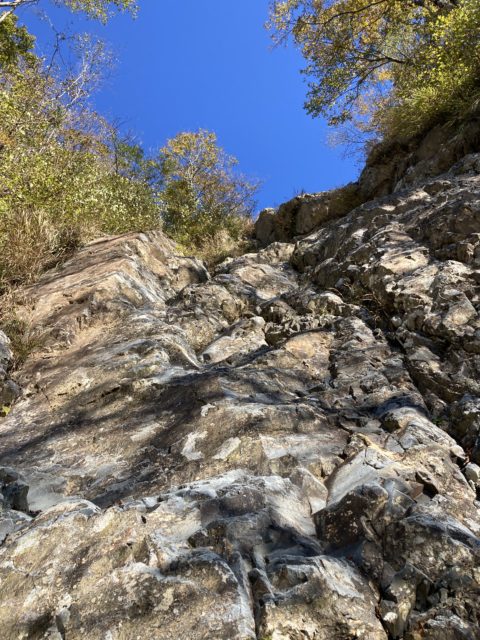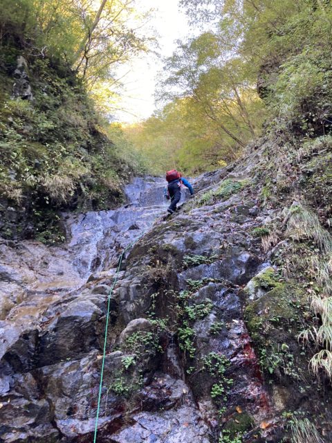 私が登る番になり取りつくと下部は落ち葉が付いてはいるがグリップの良い岩なので比較的スイスイ登れた。しかし、進むにつれ土が被るようになり嫌らしくなってきた。それでも滝と違い水や苔も無く突然グリップを失う怖さも無く、何よりロープで確保されている安心感が強い。感謝です。