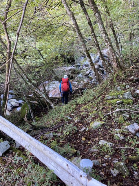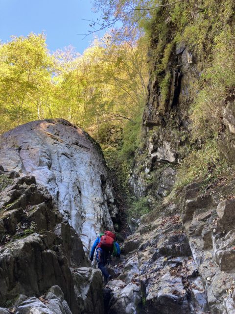 7時40分、ビジターセンターをスタートした時にはこの秋一番の冷え込みではないかと思うくらいに寒かったが、さいわい風は無く、陽射しもあり登山道に入るとすぐに体が温まってきた。入渓点までのアクセスで通るつつじ新道から小ピーク経由で林道への降り口が工事関係者の集合場所であった。朝一で山から突然現れた私たちにびっくりされていた。驚かせてしまったことを詫びつつ挨拶がてら少しお話しして先へ進んだ。