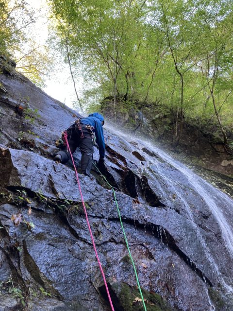 画像では、一見すると「いうほど難しいのかな?」という印象だが実際は足の置き場が傾斜しているのと滑りの強弱が掴みにくく、いつ滑るか分からない怖さがある。それと、しっかりしていそうなホールドに見えても不意に「ボロッ」と剥がれてしまう物があり印象より嫌らしかった。寒さで悴みそうな手を温めながら右側から上がり上部で水流の方へ移動する定番ルートで登った。トラバースの一歩は勇気がいるが丸山リーダーにフォローしてもらっているので安心だった。滑りそうに見えた足の置き場は思いのほか良くグリップした。