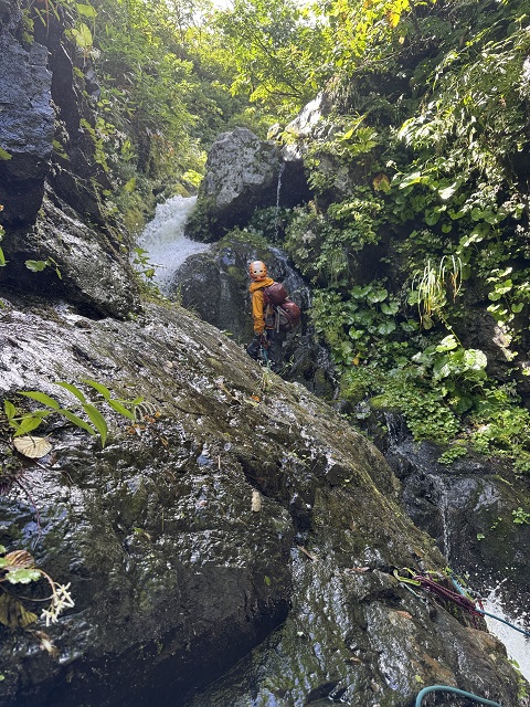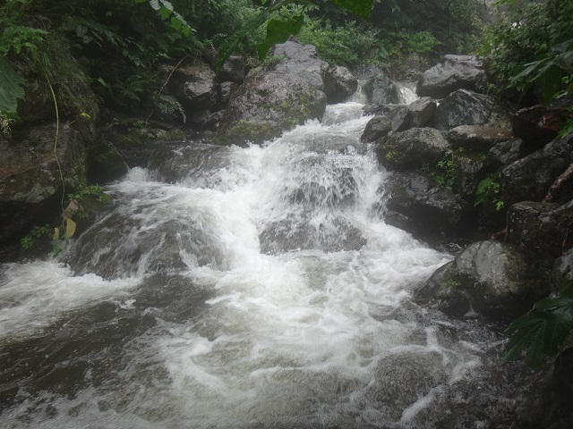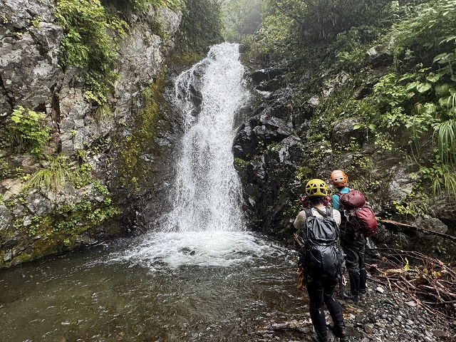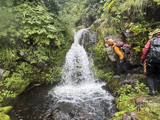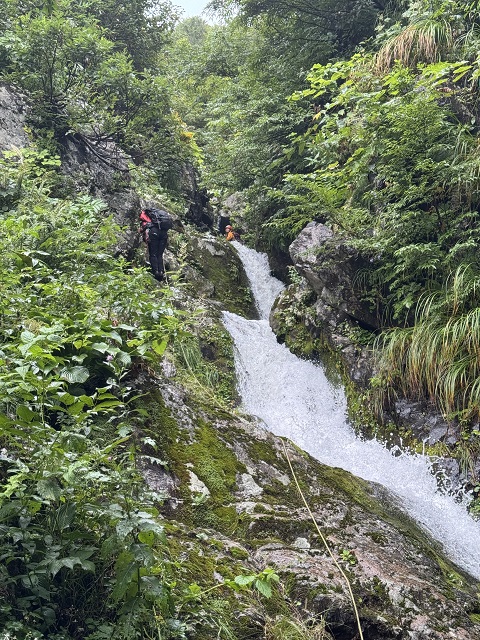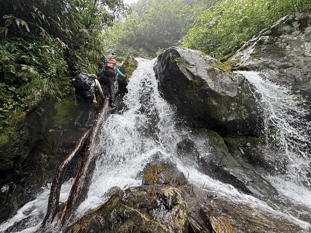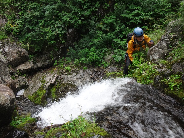 滝上に出た段階で、上の滝の突破は厳しいと判断し、戻って巻きルートに入るべきであった。この判断ミスのため、1時間ぐらい余計に使ってしまった。