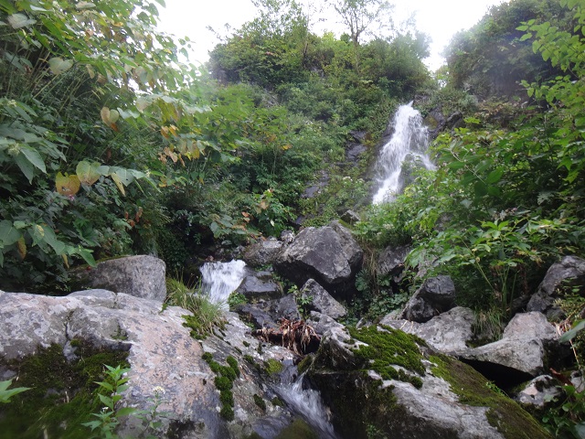 この滝は登れたのだが、上にもう1つ滝が続いており、こちらは越えられず、少し戻って灌木帯から巻く。