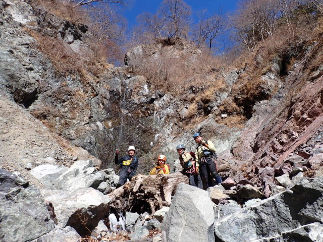 のでみんなで集合写真を撮った。水流の左から登れそうに見えるが「脆いのでむやみに取り