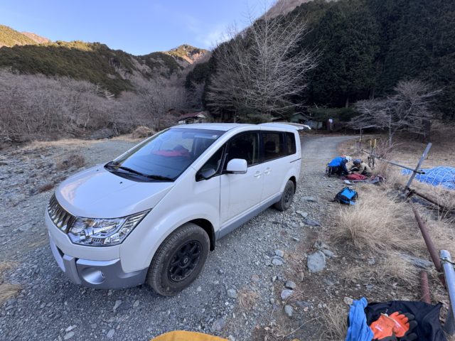 ⼾沢キャンプ場で支度を済ませ 7:40 スタート。まだ陽が当たっていないので結構寒い。