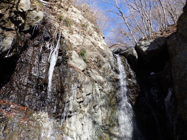 くる。両側の大岩の間を水が流れ落ちている。滝裏を探ってみたいと思ったが周囲の氷柱が
