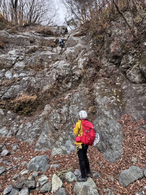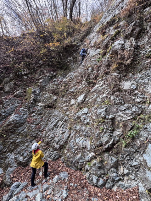 リーダーの本郷さんはここでクライミングシューズに履き替えて左側を登攀開始。中間残置支点は豊富なようで危なげなく滝上に出て立木でビレイ支点を構築してセカンド以降を確保した。