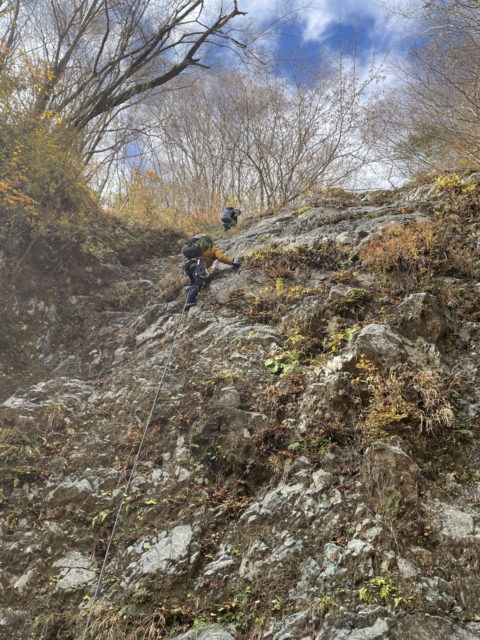下の方の紅葉も真っ赤な見ごろであり楽しめた。本谷にかかる鉄橋で先に下山して、翌日のレスキュー訓練で実施予定の登り返しを事前確認をしていたセドノ沢遡行グループと合流し、途中鮮魚やらお酒など買い出しを済ませ宿泊場所に移動した。