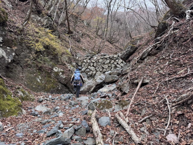 1時間半程かかった2段滝の登攀後、昼食休憩をとって遡行を再開。水流は全くないが石垣堰堤が2個連続する。