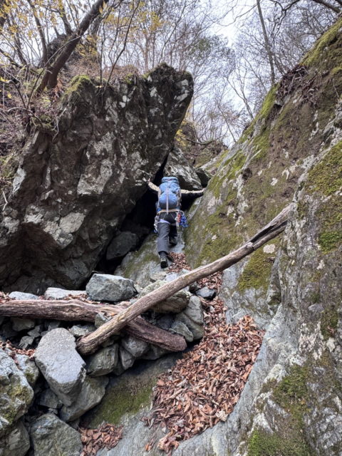 急な涸れゴーロに涸れ小棚がかかる渓相を遡行していくと、5mCSチムニー状滝が出てくるがリーダーがフリーで突破し後続にお助けを出してくれた。