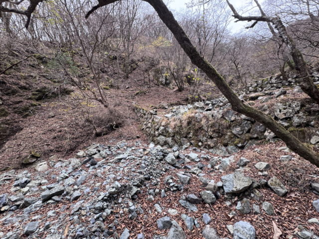 その上に、石垣が3連で続くが、昔のワサビ田跡なのだろうか?何故に石垣があるのか疑問であったが、左の支尾根にすぐに乗れそうだったのでここで脱渓した(co1150m付近)。