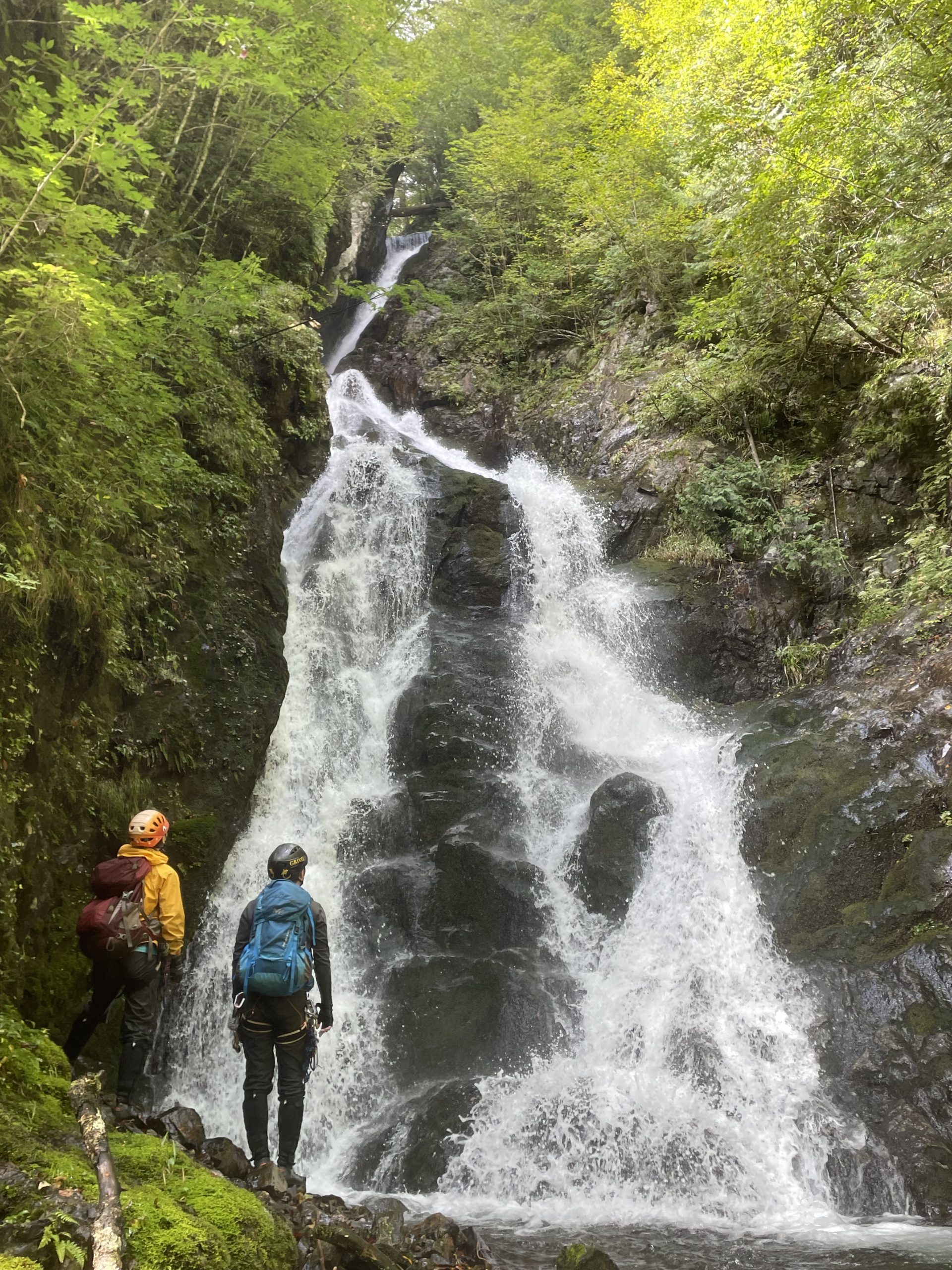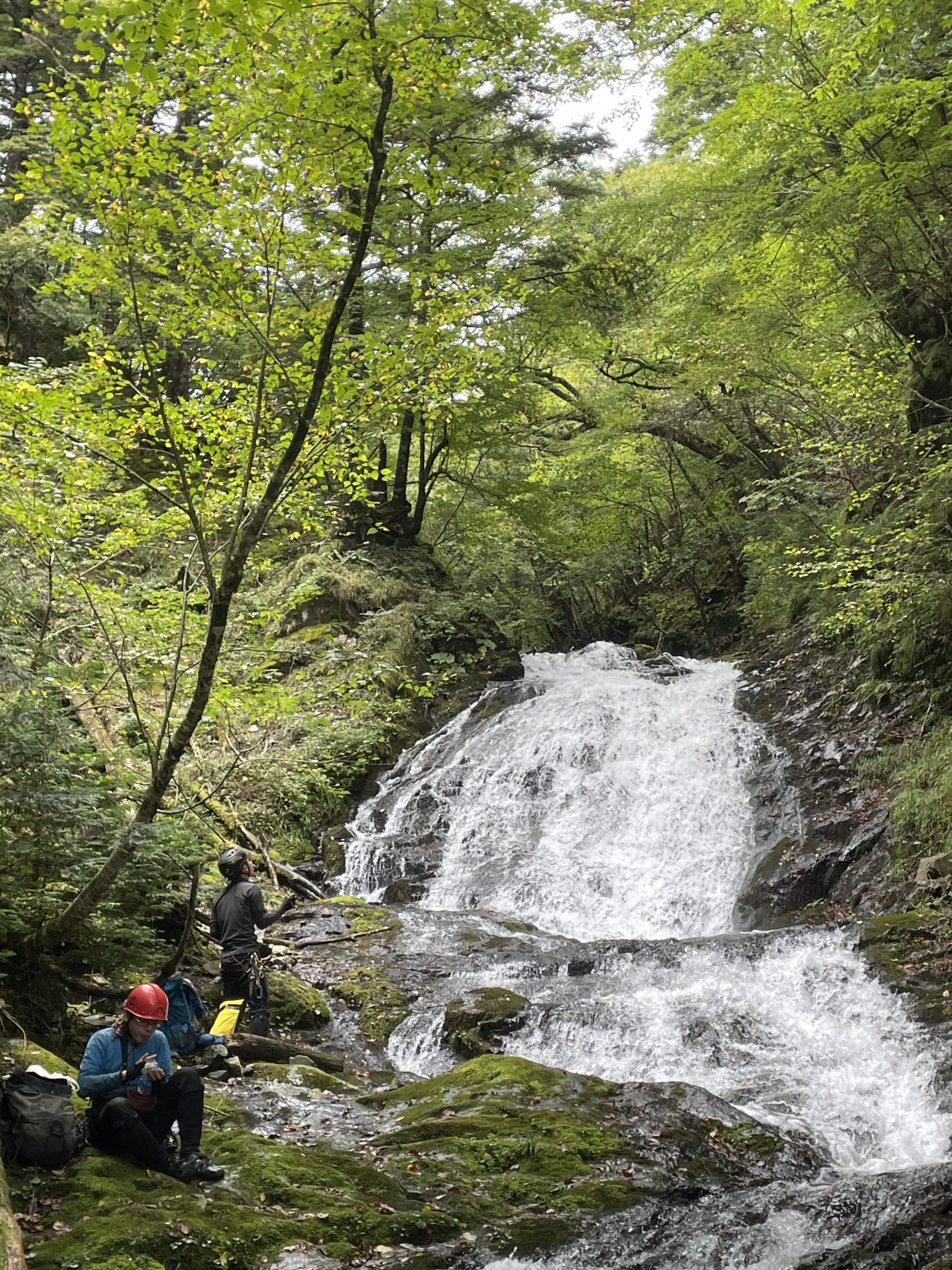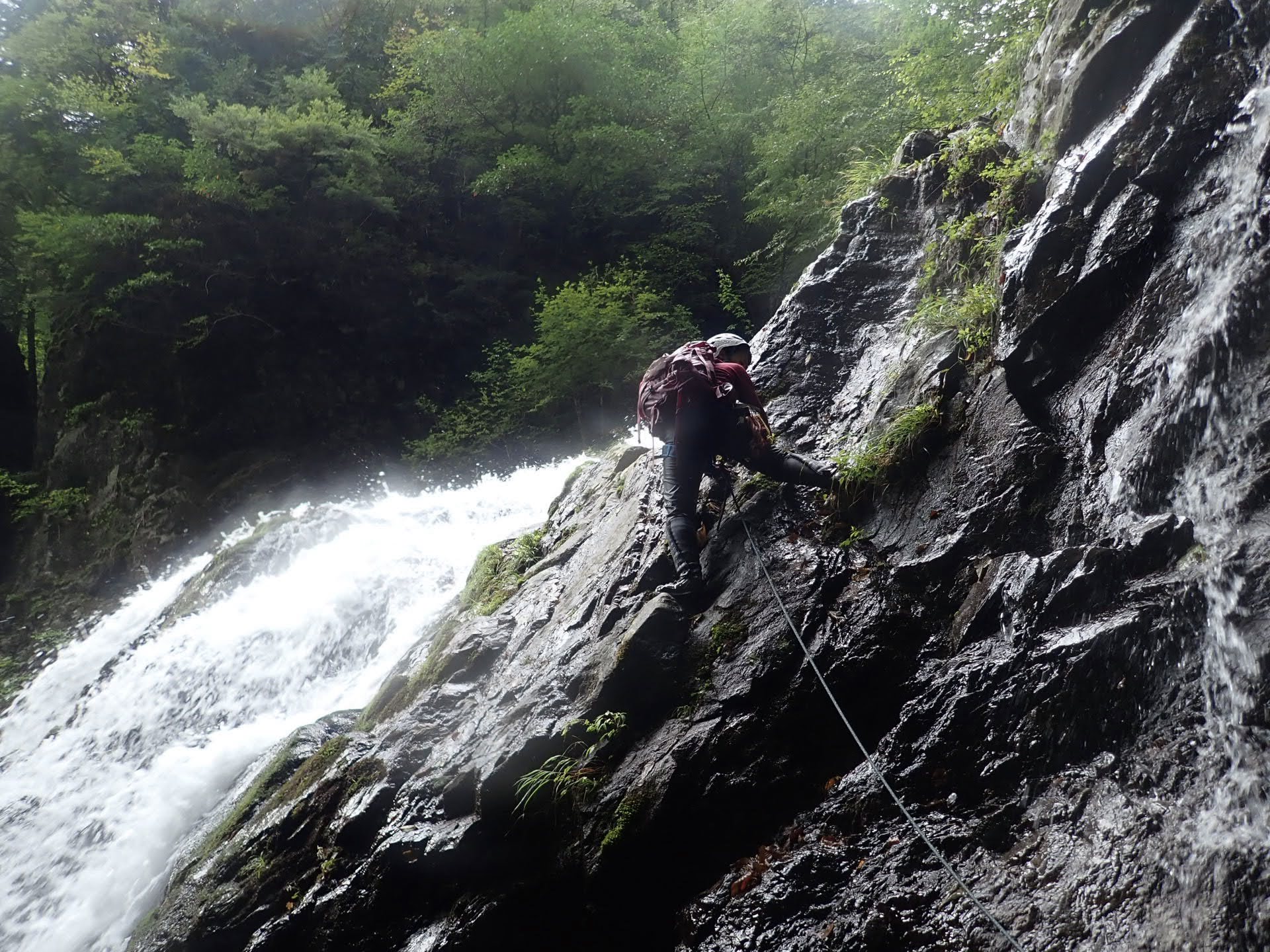 入渓してすぐすぐ、トオの滝が現れる。登れるのかどうかまだまだ判断に迷うので後ろから先輩方の声がかかる。「左からのぼれるね。」ここはロープを出し1段目、2段目と快適に登った。