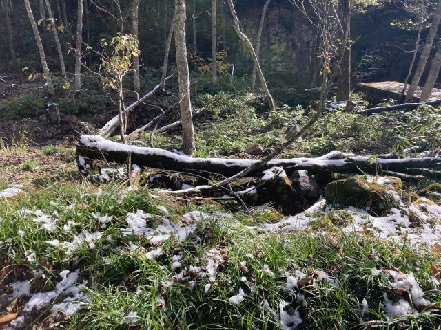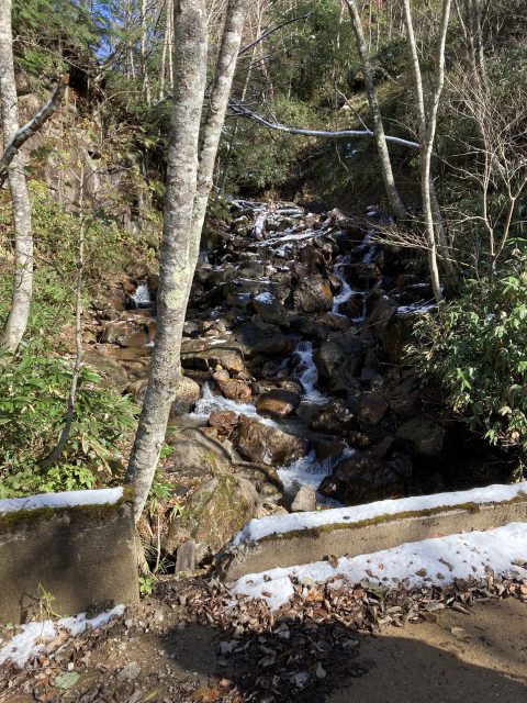 橋から入渓点を見ると岩の上にうっすらと雪が積もっています。