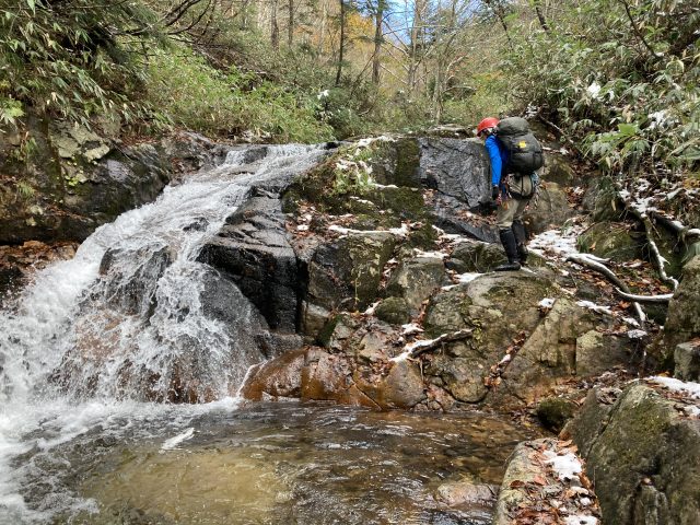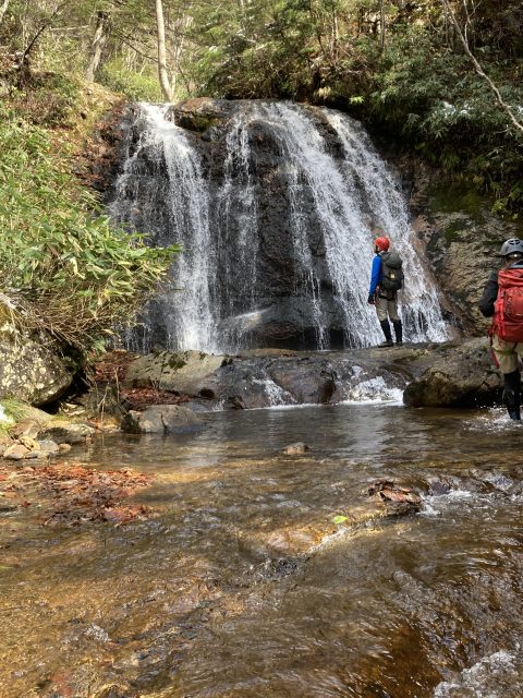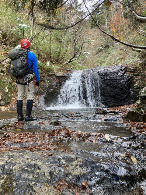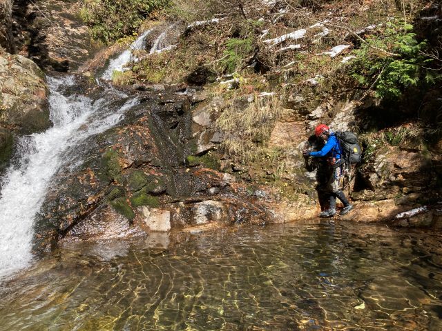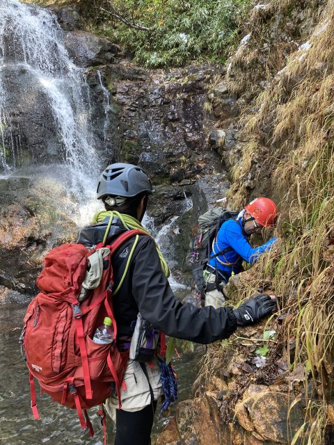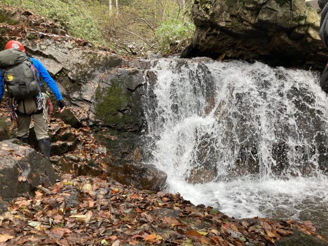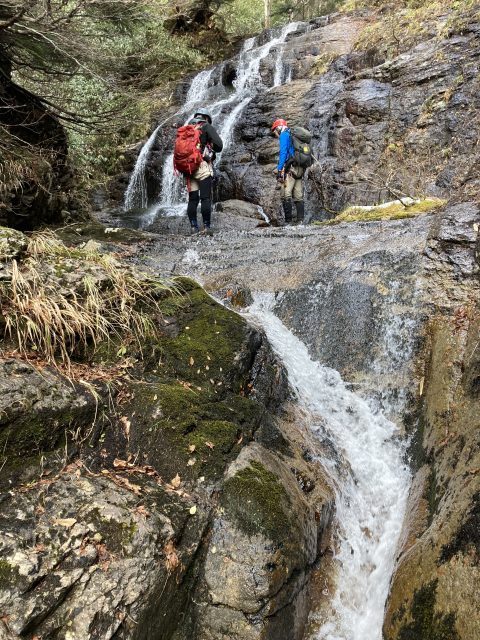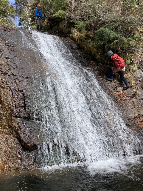 5m滝。滝左側を笹を掴みながら、ロープ確保しながら巻きました。