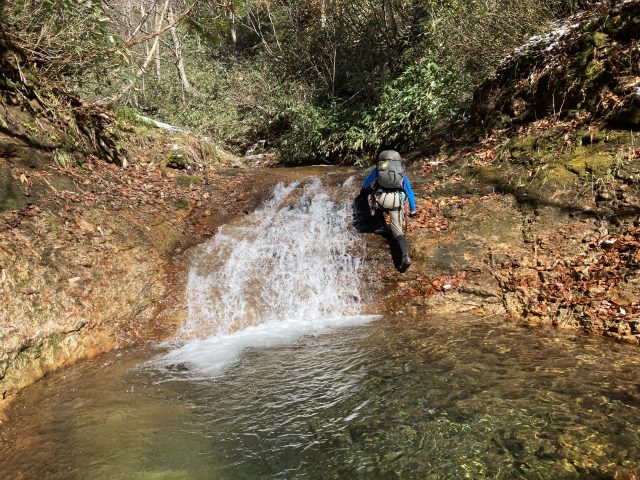 トイ状4×4m滝。釜右側をへつり滝右側の岩を登りました。