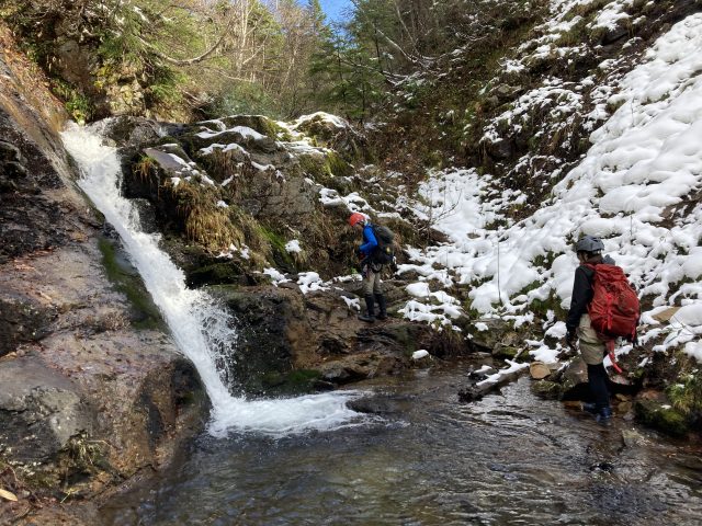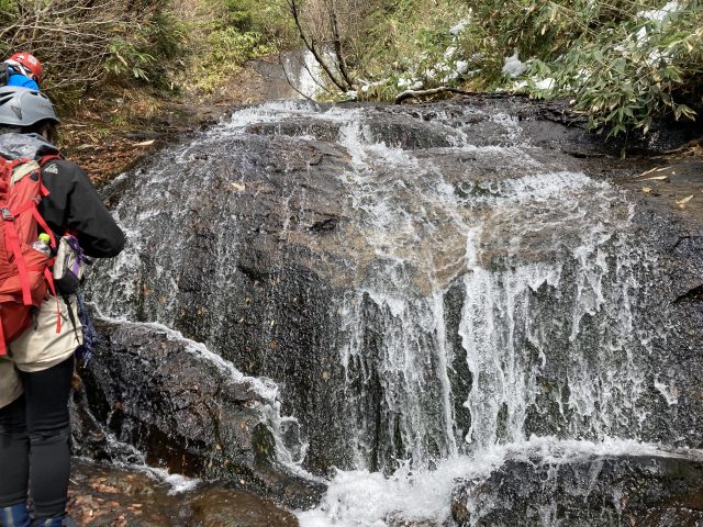 右岸側に流れる細い4m滝を滝右側の岩を登っていきます。