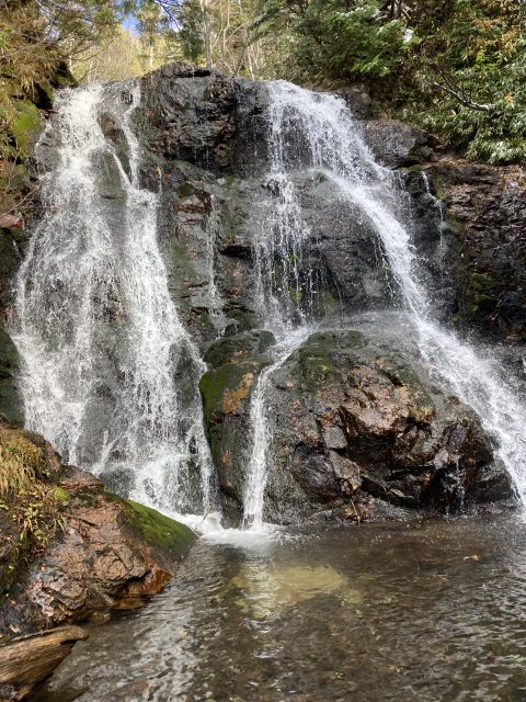 林道の途中、左側にオモジロ沢にかかる滝が間近に見えました。