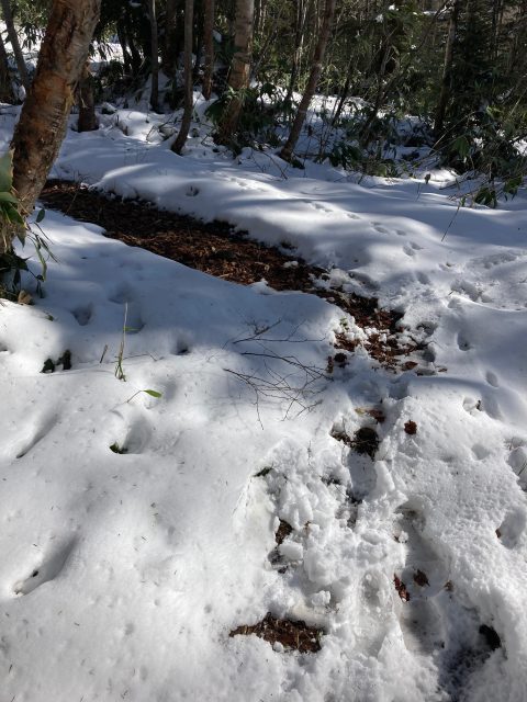 最後の滝から40分ほど歩くと登山道にでました。雪の上に動物たちの足跡も見られます。