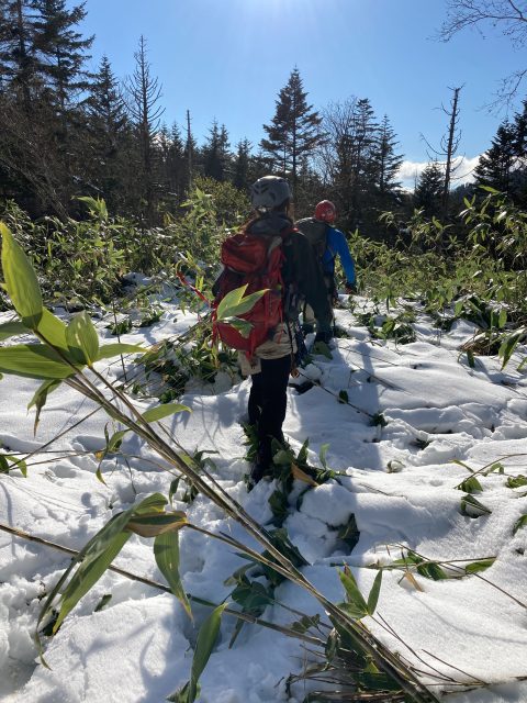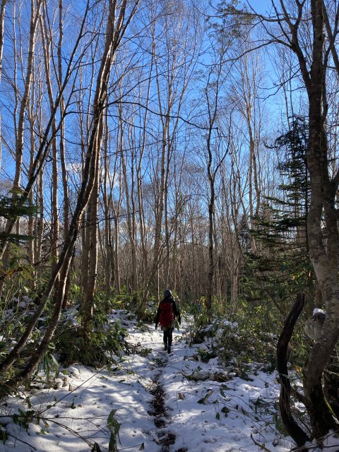 予定していた送電線巡視路での下山は降雪のため中止し、小淵沢出合橋へと続く登山道を下りました。