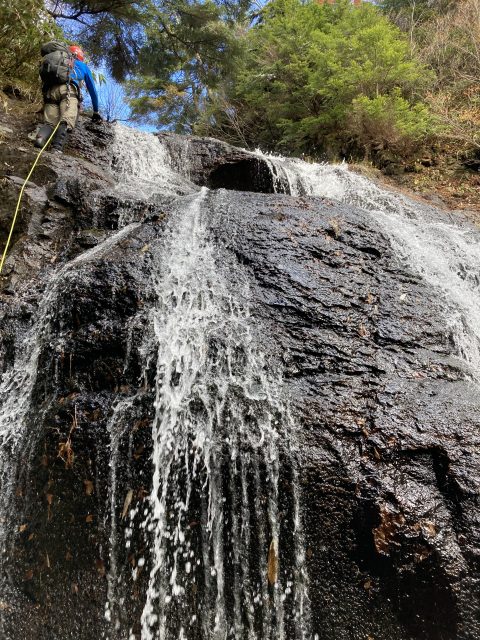 10mすだれ状ナメ滝。水流左側をロープ確保してもらい登りました。