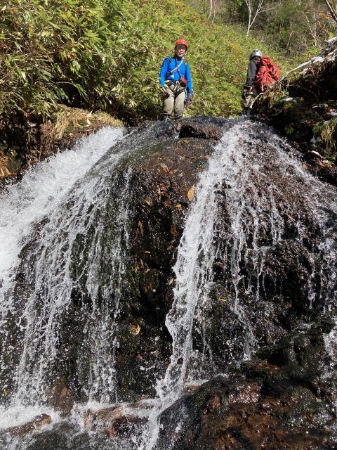 2条10m滝。釜の右側をへつり、滝の右側の岩壁を笹が生い茂るところまで登り、笹藪沿いにロープで確保してもらい登りました。