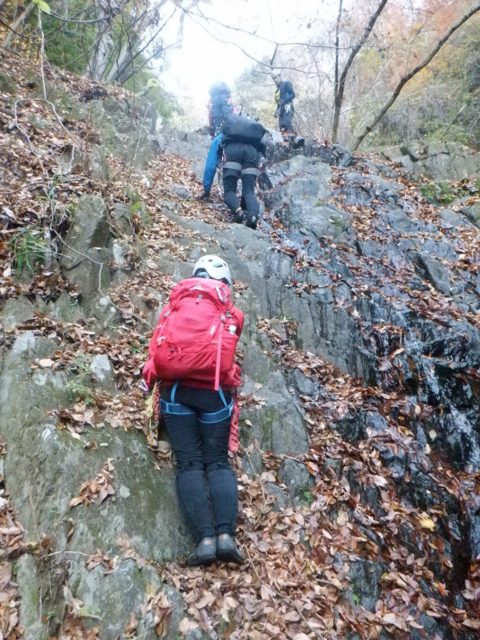 リーダーが滑落して負傷、自己脱出、ロープを持って高巻き、