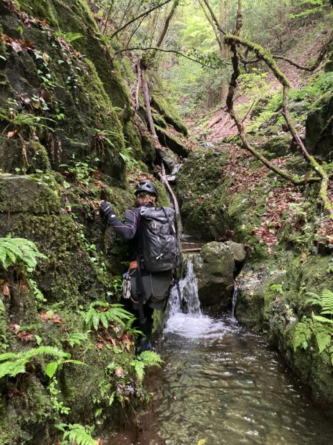 雨が上がる頃を見計らい9時に武蔵五日市駅集合、1時間後の10時に入渓した。前夜の雨の影響が気になったが、濁りは全くなく水量も平水で一安心した。今回は同行者の沢初めの足慣らしが目的だったので先行していただいた。滝登攀もほぼリードしてもらい私は前回フォローとなった末広がり10mと6m滝を登らせていただいた。核心の8m+6mの2段滝を越え25m大滝下で小休止しながら前回登った時のことを思い出しつつオブザベした。今回も水流右の滝ど真ん中を登る事にして同行者がリード。下部は残置が乏しいためハーケンを1枚打ちたいと思ったところに残置を発見、1ピン取れて安全確保できたのが良かった。同行者はその後もしっかり時間を掛けながらジワジワ登っていく。滑るように見えるが順層で足場もしっかりしているので怖くは無いようだ。上部は水流にルートを取り、水を被りながら登るのでなるべく時間を掛けたくないところだが一歩が運べないようでやや長めに被ってしまったようだ。後で本人に聞いたら「登るのに必死で水のことは二の次だった」そうだ。*リードありがとうございました。